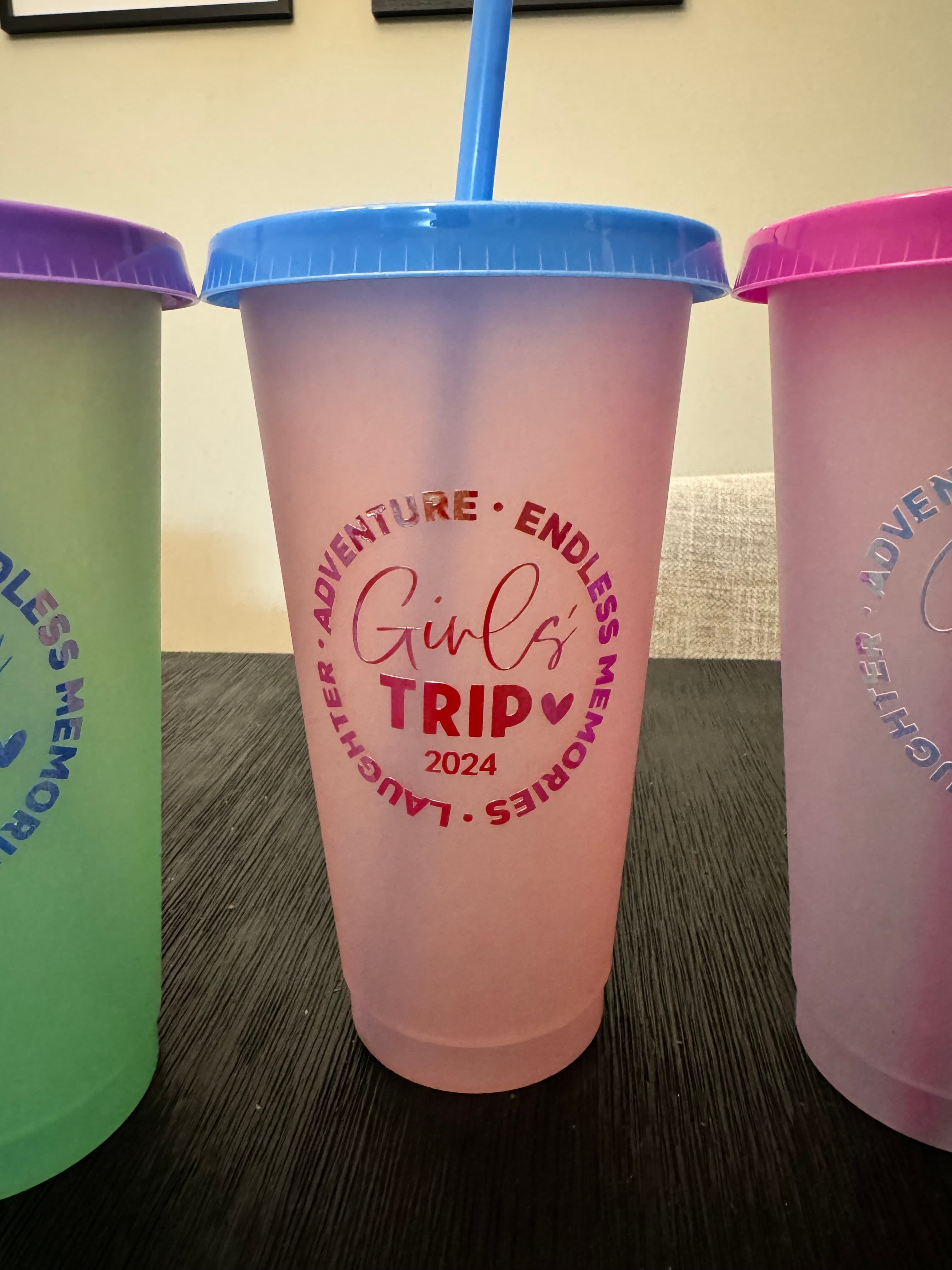 These customizable, color-changing tumblers are the perfect companion for any girls' trip, bachelorette getaway, or other fun travel adventures! Each tumbler comes in vibrant, fun colors that transform with your drink temperature, adding a playful touch to your gatherings. You can personalize them with your choice of design, including a "Girls Trip" or destination name, making them perfect for group celebrations and memories. Features: **Color-changing**: Tumblers shift colors when filled with cold beverages, creating a dynamic, eye-catching effect. **Customizable design**: Personalize with your trip's name, year, and more to make your tumbler unique. **Durable & reusable**: Made from high-quality plastic, these tumblers are designed to last and are a great eco-friendly option for your group. **Convenient straw & lid**: Each tumbler includes a lid and a matching straw, ideal for sipping on the go. Whether you're celebrating a special occasion or just looking to add a fun touch to your trip, these tumblers are sure to make your experience even more memorable. Available in a variety of colors and sizes to suit your group’s vibe!